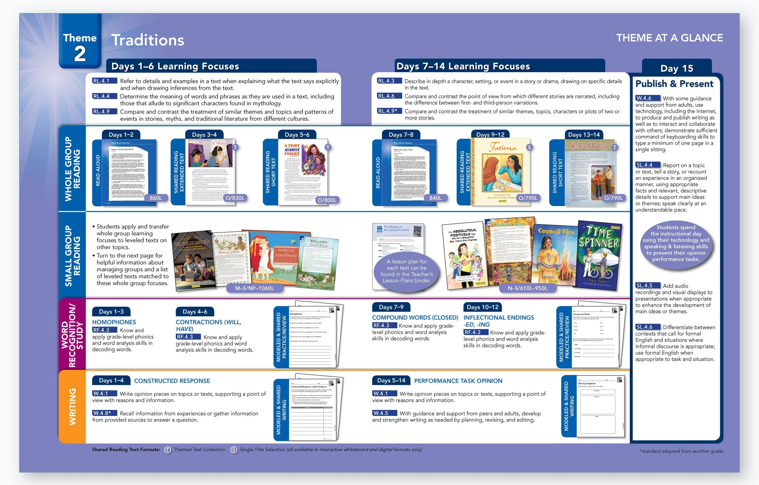 Sample Theme at a Glance design from the Bookshop Teacher’s Edition. These pages guide teachers through the materials needed for each theme and the standards covered.